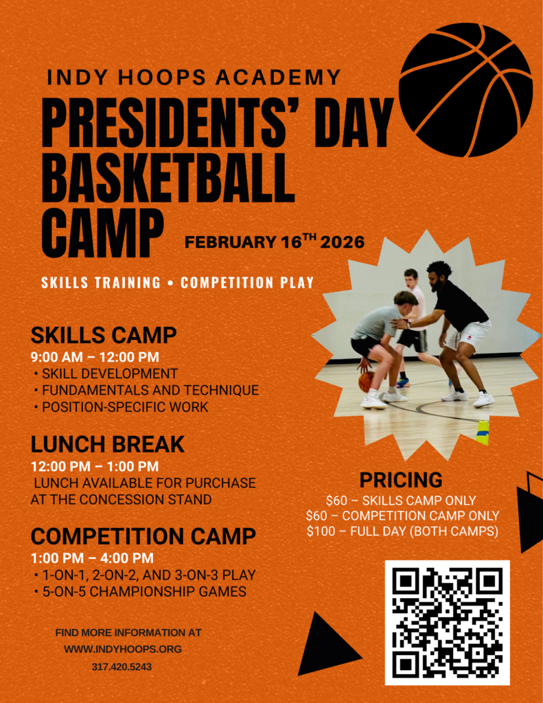 Join us for the Indy Hoops Academy Presidents’ Day Basketball Camp on Monday, February 16, 2026. This one-day camp is designed to help players sharpen fundamentals, build confidence, and compete in a fun, high-energy environment.